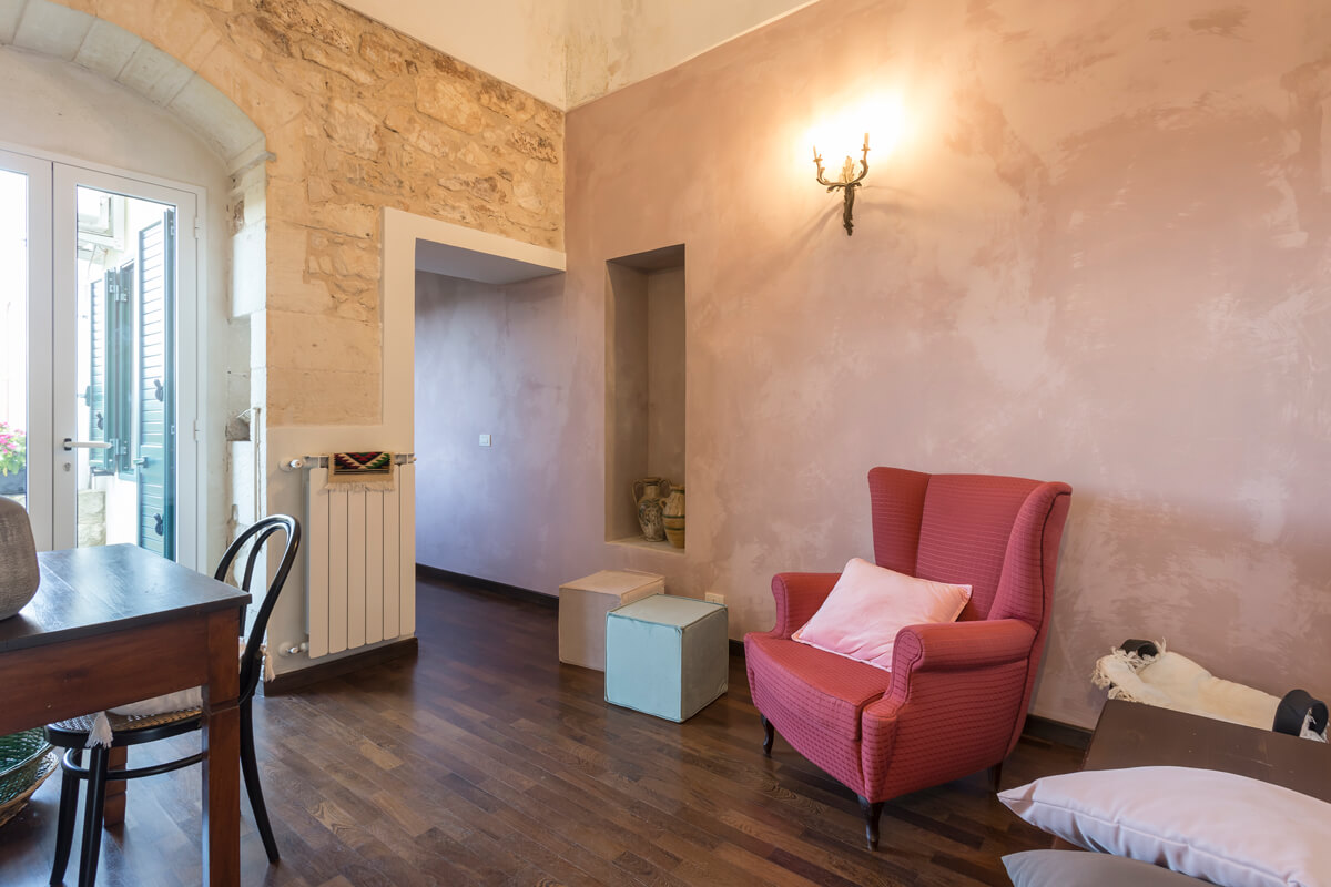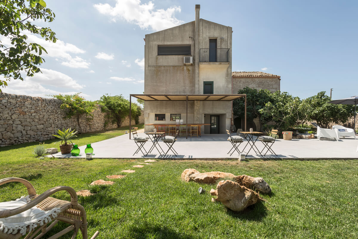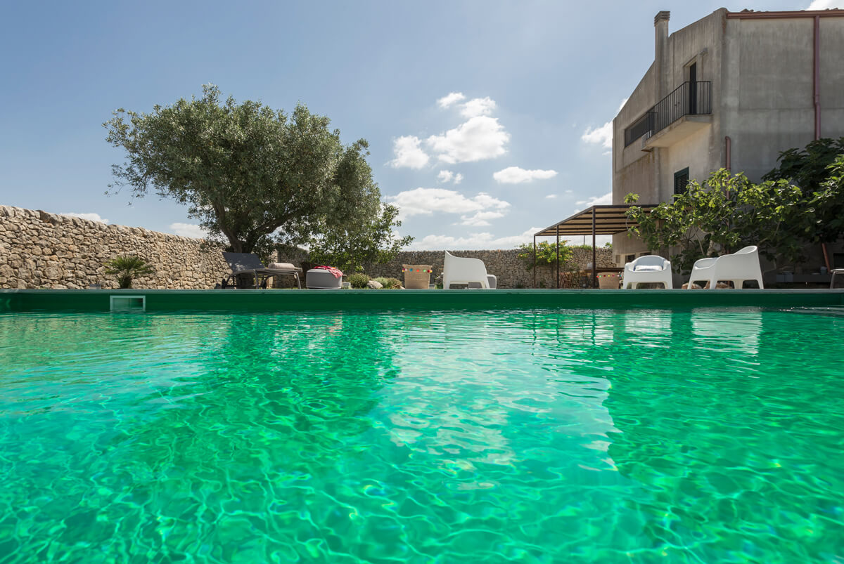 Cento metri quadrati in tutto a cui si aggiunge una veranda che dalla stanza di lettura si affaccia sul giardino e la piscina. Una delle caratteristiche di questa casa è di avere le stanze dipinte con i colori che si vedono affacciandosi dalle finestre: l’ocra della pietra iblea a vista sulle pareti e il ciano scuro del soffitto che riprende il colore delle piastrelle della vecchia cucina in muratura; il viola tenue con riflessi rossastri dei fichi nella stanza che si apre sulla piscina; verde tenero dei campi nella camera da letto.
